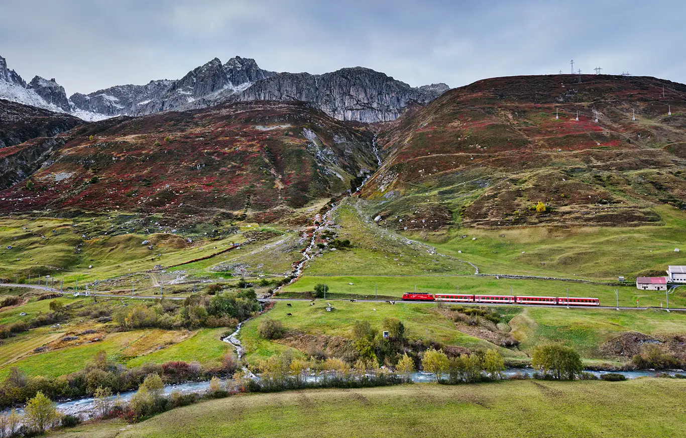 Regionalzug der Matterhorn-Gotthard-Bahn im Urserental zwischen Realp und Hospental